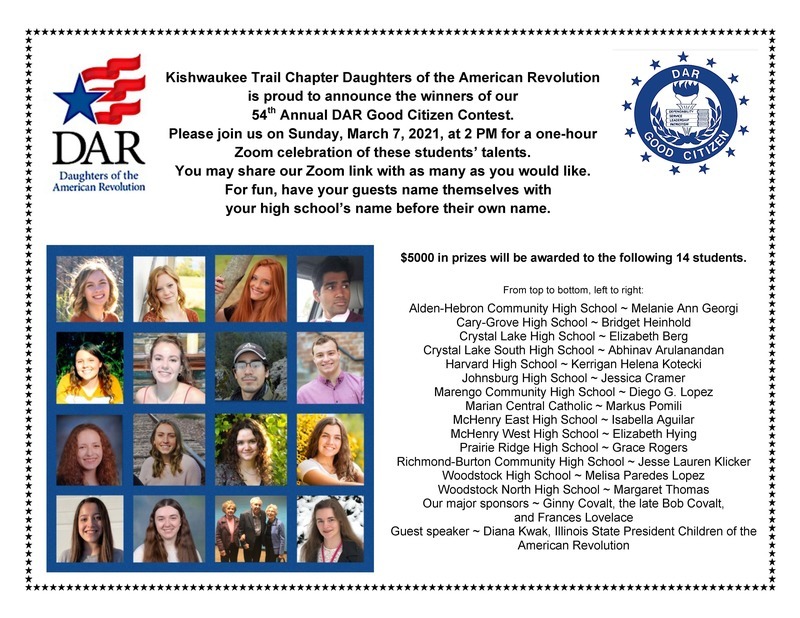 Created in 1934, the DAR Good Citizens Award and Scholarship Contest is intended to reward students who demonstrate service, leadership dependability and patriotism in their homes, schools and communities. The winners from area high schools in the Kishwaukee Valley region will share the $5,000 award.