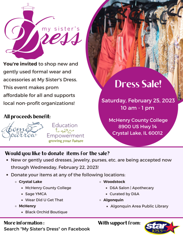 The My Sister’s Dress event is open to anyone and will be held from 10 a.m. to 2 p.m. Feb. 25 in the gym at McHenry County College. All dresses will be sold for $25, and accessories and shoes $5.