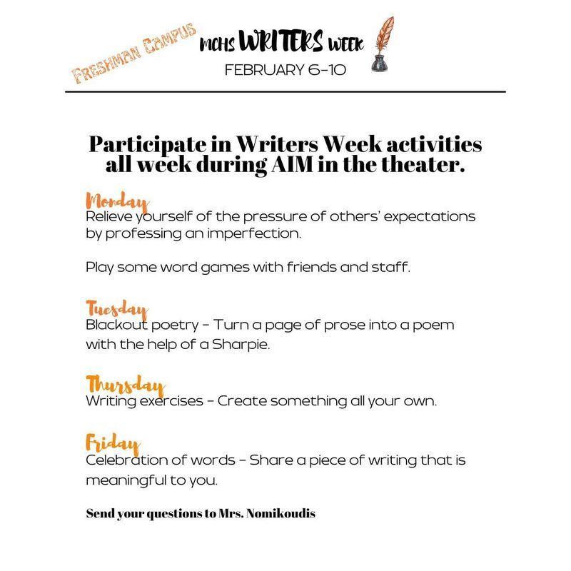 Writers Week takes place all week, starting Monday, Feb. 6, with a Celebration of Words at Upper Campus and a Profess an Imperfection activity at both Upper and Freshman campuses. The annual celebration is timed around the annual Poetry Slam for sophomore students.