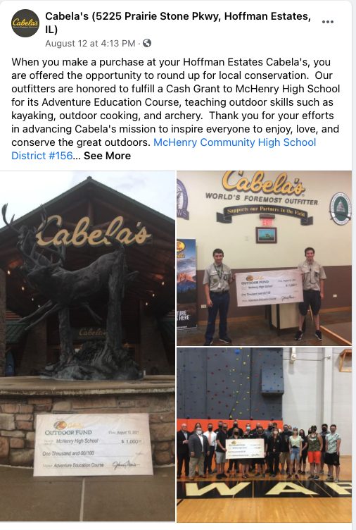 The new Adventure Education course at McHenry High School is off to a great start with the help of a recent $1,000 donation from Bass Pro Shops/Cabela’s in Hoffman Estates.