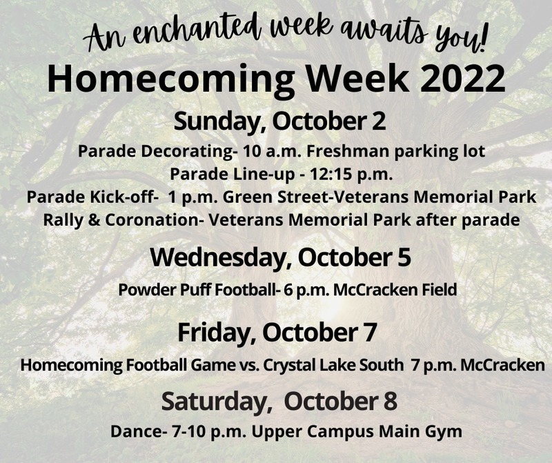 The 7 p.m. Friday night football against Crystal Lake South features an alumni tent and recognition of the 2022 Distinguished Graduate Betty Thompson. Halftime entertainment includes recognition of the 2022 boys baseball team, which finished 4th in the state in Class 4A, and the girls golf team for winning the Fox Valley Conference championship.